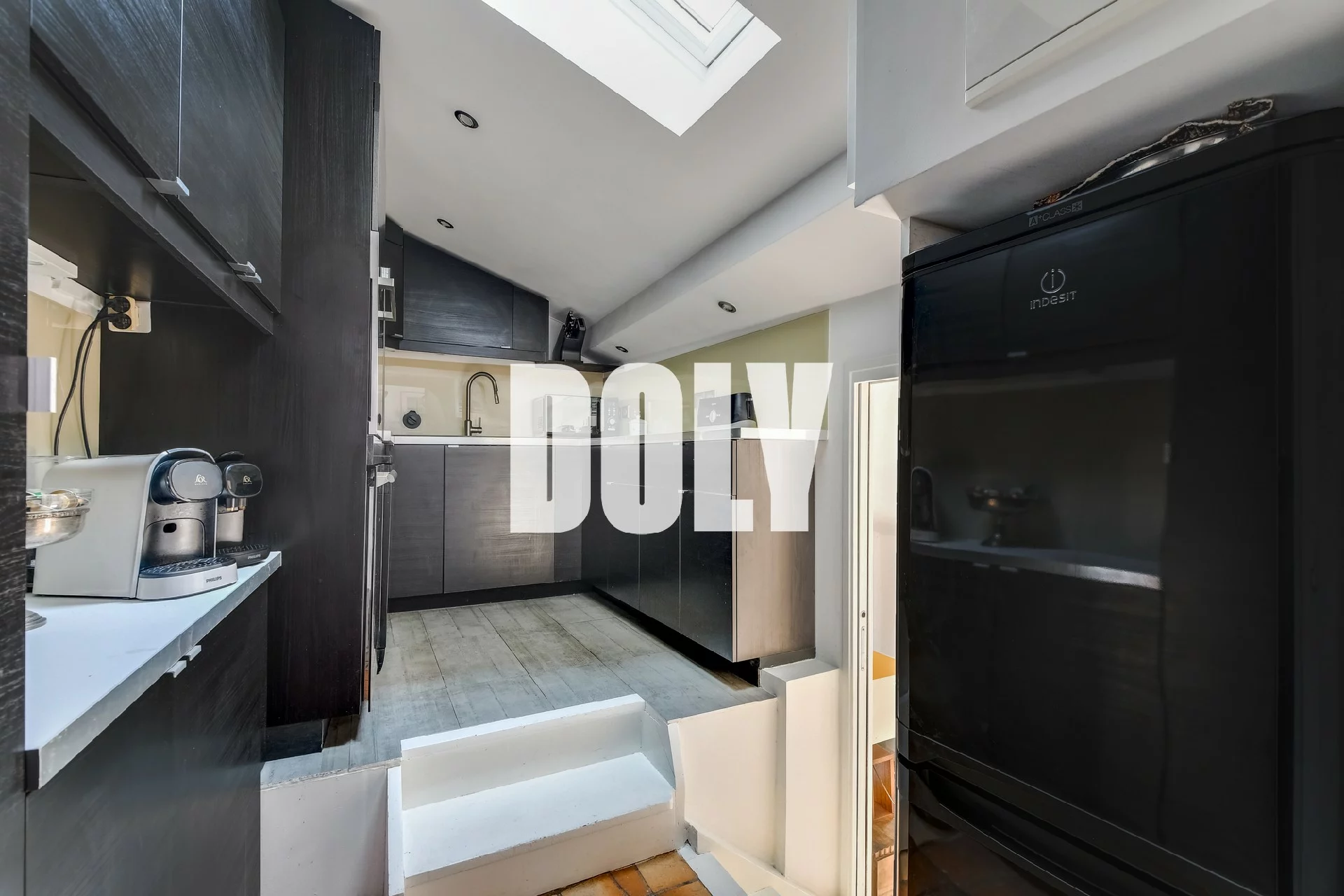 Au cinquième et dernier étage par ascenseur d’un immeuble datant de 1750, réhabilité en 1997, l’ appartement lumineux s’articule sur trois niveaux.