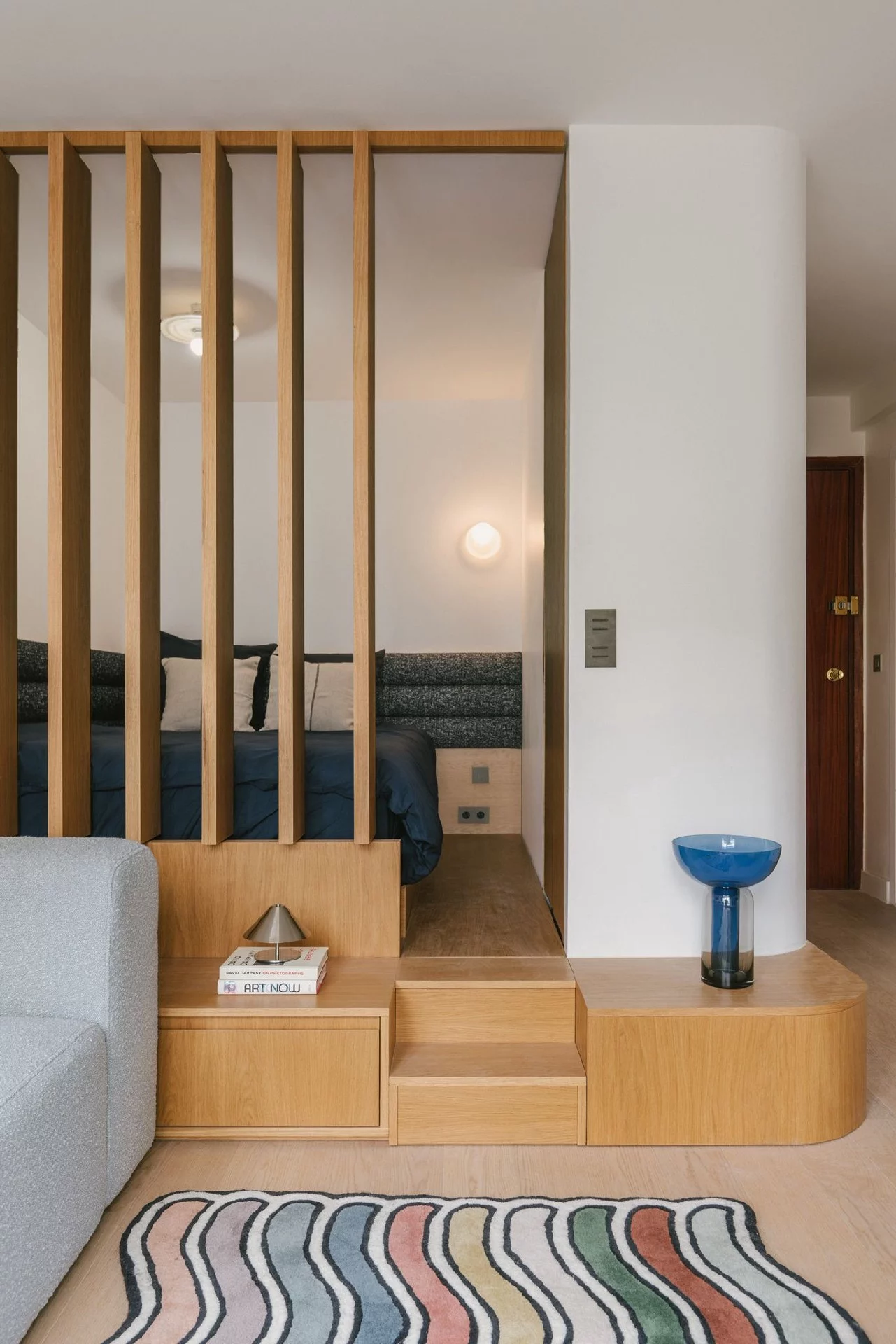 La chambre, semi-séparée par des panneaux pivotants, permet de moduler l’espace selon vos envies, entre ouverture et intimité.