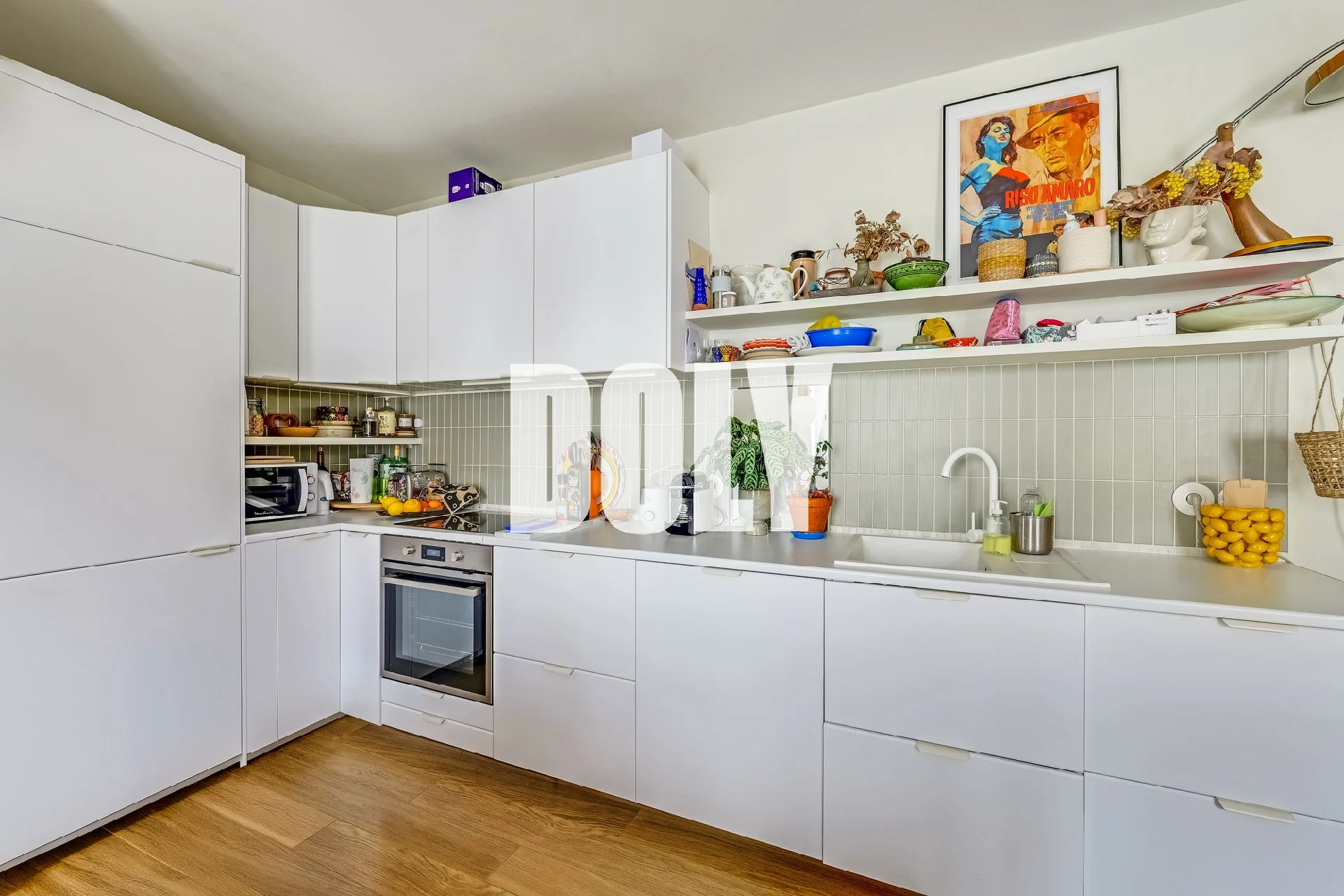 Il s’ouvre sur une entrée avec rangements sur mesure, menant à une belle pièce de vie lumineuse de 26 m2 avec cuisine ouverte, entièrement équipée.